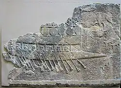 Assyrische Reliefs aus der Zeit des Sanherib (704-681 BC) zeigen ein phönizisches zweireihiges Schiff. Während die obere Ruderreihe sich weiterhin auf Dollbordhöhe befand, wurden die Ruder der unteren Reihe durch Öffnungen im Schiffsrumpf bedient. Somit konnten auch im Gefecht beide Reihen Ruderer eingesetzt werden und die für einen erfolgreichen Rammstoß notwendige Geschwindigkeit erreicht werden. Das auch hier vorhandene Kampfdeck ruhte auf Deckstützen, die auf dem Dollbord aufsaßen. Die Ruderer der oberen Reihe wurden durch seitlich angebrachte Schilde geschützt. Für Transportaufgaben wurde wahrscheinlich nur eine Ruderbank bemannt. Der Schiffstyp der Bireme trat zuerst im späten 8. Jh. v. Chr. auf und hatte sich um 700 v. Chr. bei allen griechischen und Nahost-Marinen durchgesetzt.
