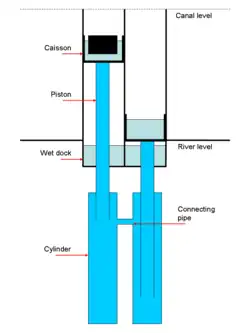 Im Normalbetrieb wurde der Wasserstand im jeweils oberen Trog etwas höher eingestellt als im unteren Trog. Dann wurde eine Druckleitung zwischen den beiden Zylindern geöffnet. Der obere Trog, aufgrund des höheren Wasserstandes schwerer, sank nun langsam ab und drückte dabei Wasser aus seinem Zylinder durch die Druckleitung in den anderen Zylinder, und hob damit den unteren Trog nach oben. Zusätzlich stand ein Hydraulikspeicher zur Verfügung, um am Anfang und Ende einer Fahrt die Tröge unabhängig voneinander bewegen zu können. Eine dampfbetriebene Hydraulikpumpe beaufschlagte den Speicher mit Druck. Es war auch möglich, die Tröge mit Hilfe des Speichers und der Dampfpumpe vollständig unabhängig voneinander zu heben. Allerdings dauerte ein solcher unabhängiger Hebevorgang mit rund 30 Minuten etwa zehn Mal so lang wie normalerweise.