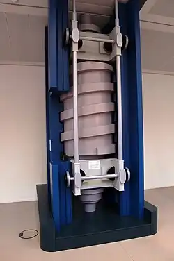 Als Sicherung gegen Abstürzen des Troges bei Seilbruch oder gegen sein Hochreißen bei auslaufendem Wasser dient folgende Konstruktion:[17] Von den Motoren wird zusätzlich je ein mit einem der vier Zahnrad-Ritzel synchron laufender sogenannter „Drehriegel“ (die Schraube eines Schraubgetriebes) angetrieben. Dieser dreht sich in einer zur Zahnstange parallel montierten sogenannten „Mutterbackensäule“ (die Mutter eines Schraubgetriebes) beim Heben und Senken des Trogs mit. Das Spiel in dieser Schraube-Mutter-Paarung ist relativ groß, so dass sich beide Teile in Hubrichtung bei entsprechender Justierung nicht berühren. Erst bei einer der beiden möglichen Havarien stützt sich der Riegel in der Säule ab: gegen das Abstürzen des Trogs nach unten oder gegen das Hochreisen durch die Gegengewichte nach oben. Die Abstützkraft bringt den Riegel nicht in Drehung, denn es besteht Selbsthemmung. Das jeweilige Zahnstangen-Getriebe besitzt eine Überlastsicherung, die in diesem Moment anspricht, wobei das Ritzel ausgeschwenkt wird. Die Mutterbackensäulen sind geschlitzt, damit die in ihr befindlichen Drehriegel mit dem Trog verbunden und von ihm aus angetrieben werden können.