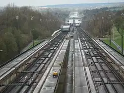 Blick auf die Gleise des östlichen Trogs beiderseits der Rinne und des Gegengewichts am Boden der Rinne -