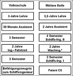 1909 wurden erstmals Befähigungszeugnisse für Schiffsingenieure ausgestellt, der Besuch einer Schiffsingenieurschule mit einem viersemestrigen Unterricht und die bestandene Prüfung waren die Voraussetzungen. Nach zwei Semestern konnte die Prüfung für das Befähigungszeugnisses zum Seemaschinisten II abgelegt werden und nach zwei weiteren Semestern die Prüfung zum Schiffsingenieur.