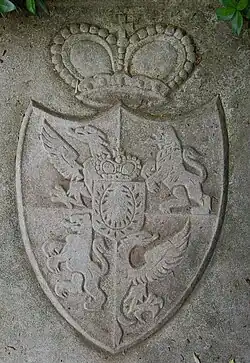 - 1738: Gespalten, rechts in Blau ein silberner Balken, begleitet von drei (2 - 1) goldenen Sternen, links in Silber ein ovaler grüner Lorbeerkranz. Zwei Helme, auf dem rechten mit blau-silbernen Decken die drei Sterne vor drei (blau, silber, blau) Straußenfedern, auf dem linken mit grün-silbernen Decken der Lorbeerkranz.
