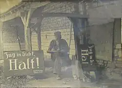 Zug in Sicht, Halt! Ein Schildermaler bei der Arbeit, um 1915