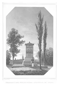 Die Idee eines Denkmals in Wesel wurde ab 1833 in der preußischen Armee vorangetrieben[3] und schließlich von Weseler Offizieren durchgesetzt.[2] Maßgeblich finanziert durch eine Spendensammlung wurde das Denkmal am 31. März 1835 eingeweiht.[3] Es entstand auf der Begräbnisstätte der Offiziere[1] in den Lippewiesen südöstlich des Weseler Stadtkerns und in der Nähe des damals noch sehr ländlichen Ortsteils Fusternberg, der bereits Teil des Stadtgebiets war. Das von Karl Friedrich Schinkel entworfene Denkmal hat auf der Vorderseite und der Rückseite je ein Relief. Es enthält Nationalsymbole Preußens, die Namen der Offiziere und die Inschrift „Sie starben als Preußen und Helden am 16. September 1809“. Die Gedenktafeln wurden von der Königlich Preußische Eisengießerei in Berlin gefertigt.[3]