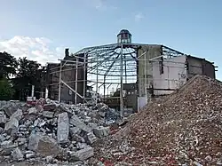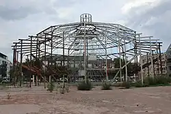 Nach weiteren gerichtlichen Auseinandersetzungen sowie einer zum Jahresende 2020 erneut ergebnislos verstrichenen Fristsetzung der Stadt[35] musste Ende März 2021 wegen Einsturzgefahr mit dem Abriss einiger Nebengebäude begonnen werden.[36] Mitte April 2021 erklärte die Eigentümerin, die Sicherung des denkmalgeschützten Stahlgerüsts der Rotunde nun vornehmen zu wollen.[37] Die zunächst problemlos angelaufene Entkernung musste Ende August 2021 wegen unsachgemäßer Durchführung durch die Stadt gestoppt werden. Das Bauwerk wurde bis zum Frühjahr 2022 durch eine Stützkonstruktion gesichert, die Bauarbeiten stehen seitdem still.