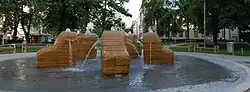 Brunnen im Schillerpark Der Brunnen wurde 1983 von Hans Muhr gestaltete und mit einem wesentlichen Beitrag der Österreichischen Spielbanken-AG errichtet. Er zeigt fünf in einem Kreis von 8 Metern Durchmesser sitzende, blockhafte Figuren, dessen Wasserstrahlen Kopf und Arme symbolisieren sollen.