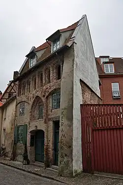 Der dreigeschossige traufständige Backsteinbau ist im Kern ein Dielenhaus aus der Zeit um 1350, welches ungewöhnlich vollständig erhalten ist. Die ursprüngliche Gliederung der Fassade mit dem hohen Spitzbogenportal der Diele und den flankierenden Fenstern lässt sich noch gut ablesen. Segmentluken sind unter der Traufe angeordnet.