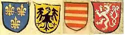 Die vier schweizerdeutschen Standardfarben Schilten, Eicheln, Schellen und Blumen wurden auf Spielkarten in einem Buchdeckel (um 1530) in Basel gefunden. Diese Karten zeigen das charakteristische Banner anstelle der Zehnerkarte und die drei Bildkarten: König auf dem Thron, Ober und Under.[5] Dieses schweizerisch-deutsche Farbsystem dürfte sich früher entwickelt haben; das früheste Beispiel stammt aus der Zeit zwischen 1433 und 1451, allerdings sind nur Karten der Farbe Schilten erhalten.[1]