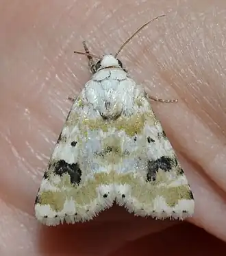 Die Falter erreichen eine Flügelspannweite um die 26 Millimeter.[1] Zwischen den Geschlechtern besteht farblich kein Unterschied. Die Grundfarbe der Vorderflügeloberseite ist cremig weiß. Basal- und Submarginalregion sind mehr oder weniger gelblich bis gelbbraun gefärbt. Die Nierenmakel hebt sich schwarzbraun ab und ist sehr groß, während die Ringmakel zu einem kleinen schwarzen Punkt reduziert ist. Die Hinterflügeloberseite ist weißlich, im Außenrandbereich graubraun und zeigt einen dunklen, halbmondförmigen Diskalfleck.