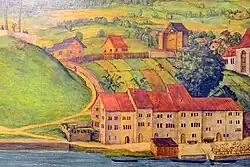 Flussabwärts, am westlichen Ende der Schipfe befanden sich fünf Mühlen auf dem Unteren Mühlesteg und die Papierwerdinsel, wie auf dem Murerplan (1576) von Jos Murer zu erkennen ist.[7] Die Mühlen in Limmat und Sihl gehörten im Mittelalter zum umfangreichen Grundbesitz der Fraumünsterabtei. Von Hans Georg Werdmüller wurde 1666 das städtische Wasserrad an der Schipfe errichtet: Das erste Pumpwerk der Stadt pumpte Flusswasser auf den Lindenhof, von wo das Wasser in die Altstadt verteilt wurde. Einige Jahre später erfolgte der Bau einer zweiten, von der Rathausbrücke ausgehenden Wasserleitung.[5]