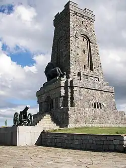 Über dem Eingang zum Denkmal steht ein aus Bronze gegossener Löwe von 8 m Länge und 4 m Höhe. Der Löwe ist das Wappentier Bulgariens und symbolisiert auch gleichzeitig Mut und Tapferkeit der Verteidiger. Mit dem Denkmal wird der Helden der (ersten) Schlacht am Schipkapass gedacht (nach gregorianischem Kalender vom 9. bis 11. August 1877). Hier verteidigten sich unter der Führung von General Stoletow 5.500 Russen mit 27 Geschützen und bulgarische Freiwillige gegen 27.000 Türken unter Süleiman Pascha.