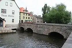 Aufgrund von Schäden an den alten Natursteingewölben wurden schließlich im Jahr 1965 vier Bögen durch Betongewölbe ersetzt sowie die zwei westlichen Gewölbe an der Neuen Mühle abgebrochen und verfüllt. Seitdem hat die Schlösserbrücke vier wasserführende Durchlässe, von denen an der Südseite drei sichtbar sind und einer durch die Neue Mühle verdeckt ist. Unterstrom sind zusätzlich die zwei verfüllten Öffnungen erkennbar.