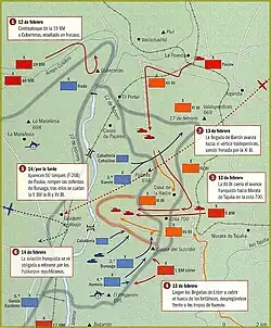 Des Weiteren stieß am 12. Februar die nationalistische Brigade von Sáenz de Buruaga gegen die Straße von Arganda del Rey nach Madrid vor. Sie wurde aber von der XI. Internationale Brigade mit dem Thälmann-Bataillon, dem Dimitrow-Bataillon und einer sowjetischen Panzereinheit mit T-26-Panzern zum Fluss Jarama zurückgedrängt.[1][5] Dieser Gegenangriff wurden jedoch mit Hilfe der auf La Marañosa eingegrabenen nationalistischen Artillerie zurückgeschlagen.