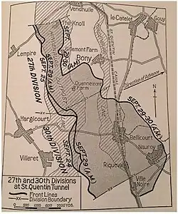 - ↑ C.E.W. Bean: Volume VI – The Australian Imperial Force in France during the Allied Offensive, 1918 (1st edition, 1942), pages 984, 985, 986, 995, 1008, 1013 and 1027 lists the following German divisions facing the attack: 54th, 121st, 185th, 75th Reserve, 21st, 2nd Guards, 2nd, 119th, 241st, 54th, 24th, 8th and 21st Reserve divisions. NOTE: That this list is incomplete, as it doesn't include the forces facing the Allies after the 5th of October.