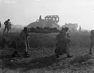 ![]() Deutsche Gefangene tragen einen Verwundeten, im Hintergrund Mark V Panzer mit Faschinen, Aufnahme 2. Oktober 1918 in der Nähe von Bellicourt | |||||||||||||||||