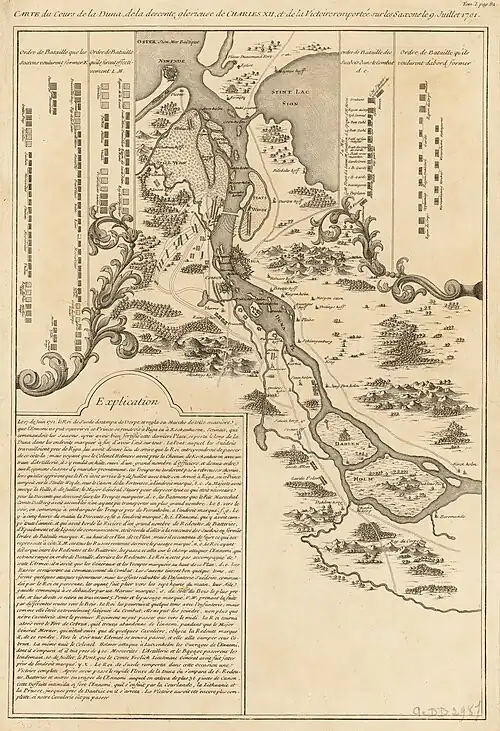 - ↑ Chorographische Delineation der Glükligen Descente über die Düna, sambt der darauff erhaltenen Victorieusen Bataille Seiner Königlichen Mayestet von Sueden Carl XII. (zeitgenössische Darstellung des Übergangs über die Düna)