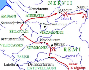 Gaius Iulius Caesar marschierte 57 v. Chr. mit seinen acht Legionen im Zuge seiner Eroberungszüge während des Gallischen Kriegs nach Norden. Durch Kundschafter und Kriegsgefangene erfuhr er, dass die Nervier, ein mächtiger keltischer Volksstamm, sich mit den Atrebaten und den Viromanduern verbündet hatten und die Römer an der Sambre mit einem großen Heer erwarteten.[1] Caesar erwartete also einen Hinterhalt, beklagte sich aber auch, dass aufgrund der dichten Wälder und der vielen, von den Nerviern angelegten Hecken[2] in diesem Teil Galliens die Feinde nicht aufgespürt werden konnten.