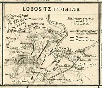 Zwischen dem 420 Meter hohen Lobosch-Berg und Wawczin vollzog sich der preußische Aufmarsch. Vor Lobositz entwickelte sich der Hauptkampf, Ziel der angreifenden Preußen war es, die Österreicher auf die Elbe zurückzudrängen. Der rechte Flügel unter Prinz Ferdinand von Braunschweig lehnte sich am Homolka-Berg, der linke Flügel unter dem Herzog von Bevern begann sich auf den Weinbergen des Lobosch gegenüber den Österreichern unter General Lacy zu formieren. Eine Infanteriebrigade unter Generalleutnant von Kleist sicherte im Zentrum, hinter dem rechten Flügel marschierte unter Feldmarschall Graf Geßler fast die gesamte Kavallerie (52 Schwadronen) in drei Treffen auf. Die Österreicher zählten etwa 35.000 Mann, die Preußen 28.000 Mann.[1] Der Angriff der preußischen Kavallerie, die unerwartet auf den Feind stieß, wurde zwar nach dem Eintreffen der österreichischen Kürassiere unter General Radicati und Generalmajor Karl Claudius O’Donnell abgeschlagen, die preußische Infanterie erstürmte aber in der Schlussphase den Ort Lobositz und zwang die Österreicher zum Rückzug.
