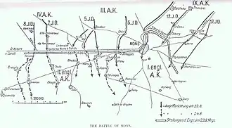 Eine (Falsch-)Meldung über gegnerische Truppenkonzentrationen bei Tournai – an der rechten Flanke der deutschen 1. Armee – veranlasste deren Befehlshaber (Generaloberst von Kluck) um 9.30 Uhr vormittags zu einem allgemeinen Haltebefehl. Der festgelegte Haltepunkt (Straße Leuze-Mons-Binche) lag zum Teil jenseits der Kanallinie und war insbesondere vom linken Flügel der Armee noch nicht erreicht worden. General von Quast, der Befehlshaber des in dieser Richtung angesetzten IX. Armee-Korps entschloss sich daher zur Fortsetzung des Vormarschs und beauftragte die 18. Division (Generalleutnant von Kluge) mit der Besetzung der Übergänge über den Canal du Centre bei Nimy und Obourg. An den Übergängen entwickelten sich heftige Kämpfe mit Truppen des britischen 1. Corps, welche die Angreifer für sich entscheiden konnten. Nimy wurde gegen 16 Uhr gestürmt. Das südlich anschließende Mons konnte kurz darauf kampflos besetzt werden. Im Südosten und Osten der Stadt Widerstand leistende britische Truppen wurden gegen Abend im Verein mit der weiter östlich über den Kanal gegangenen 17. Division (Generalleutnant von Bauer) nach Südwesten zurückgeworfen.[10]