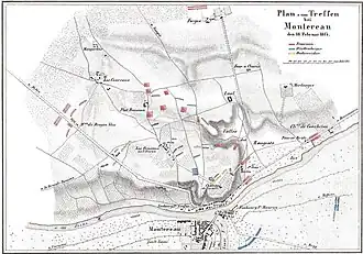 - ↑ der Bürgermeister Montereaus hatte sich schon während des Tages auf der französischen Seite im Gefecht engagiert
