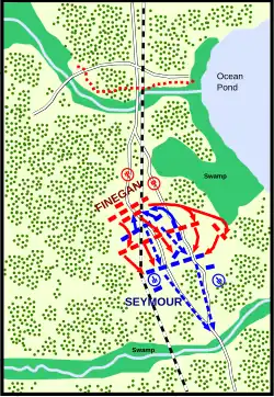 Als Finegan von Seymours Herannahen erfuhr, ließ er Teile von Oberst Harrisons Brigade und die Kavallerie vorrücken. Diese Verbände sollten mit den Nordstaatlern scharmützeln und sie dann auf die Hauptstellung der Konföderierten locken.[40] Er änderte dies jedoch, als er erfuhr, dass Seymour nur drei Infanterieregimenter und etwas Kavallerie bei sich hatte- eine Fehlinformation, die zeigt, dass beide Seiten keinen guten Überblick über die ihnen gegenüber stehenden Verbände hatten. Finegan orderte General Colquitt mit einem Teil seiner Brigade nach vorne, um Kontakt mit dem Feind aufzunehmen, unterstützt von einer zweiten und später einer dritten Welle. Insgesamt beorderte Finegan somit den Großteil seiner Streitmacht aus ihren Befestigungen nach vorne. Etwa fünf Kilometer östlich von Olustee kam es zum Gefecht. Das Gelände war eben und von Kiefern bewachsen, hinter denen einzelne Soldaten, nicht aber ganze Verbände Deckung finden konnten. Im Norden und Westen schloss sich eine dicht bewachsene, sumpfige Bucht an, davon abgesehen war der Boden des Schlachtfeldes fest und begehbar.[41]