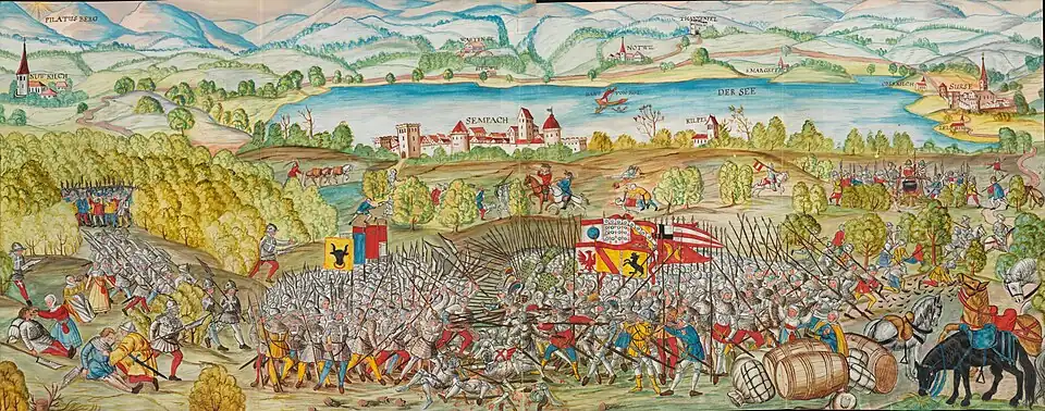 ![]() Die Schlacht auf dem Fresko in der Schlachtkapelle von Sempach (1653[1]) | |||||||||||||||||