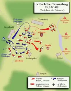 Die Schlacht bei Tannenberg, auch Schlacht bei Grunwald (polnisch Bitwa pod Grunwaldem, litauisch Žalgirio mūšis) wurde am 15. Juli 1410 im Ordensland Preußen unweit der Orte Tannenberg und Grünfelde ausgefochten. Das Heer des Deutschen Ordens unter Hochmeister Ulrich von Jungingen sowie Aufgebote der preußischen Landstände und eine unbekannte Zahl von Söldnern nebst west- und mitteleuropäischen Rittern trug dort das entscheidende Treffen gegen eine gemeinsame Streitmacht des Königreichs Polen unter König Władysław II. Jagiełło sowie des Großfürstentums Litauen unter Großfürst Vytautas aus.