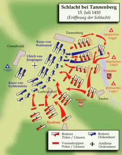 Das Ordensheer stand ursprünglich gleichfalls in drei Linien. Als Hochmeister Ulrich von Jungingen die lange Front der Polen-Litauer erkannte, gruppierte er sie in zwei Linien um und verbreiterte damit die Aufstellung seines Heeres, um nicht vom Gegner umgangen zu werden.[5] Auf dem rechten Flügel des Ordensheeres stand der Großteil ordensfremder Ritter, zusammengefasst unter der Fahne des Heiligen Georg. Auf beiden Seiten waren die Ritter in Banner gegliedert. Bei den Litauern gliederten sich die Krieger in Stammesverbände unter dem Kommando eines Bojaren, Teile des Fußvolks blieben zum Schutz der Heerlager zurück.