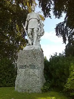 Das Schlachtdenkmal wurde von Otto Steiger geschaffen und am 12. Juli 1903 eingeweiht.[1] Die Skulptur stellt einen mahnenden Appenzeller Bauer mit Morgenstern aus dem Jahret mit spähendem Blick Richtung der nahen Stadt St. Gallen dar. Das Denkmal befindet sich entgegen dem tatsächlichen Schauplatz etwa ein Kilometer südöstlich auf der Krete der Vögelinsegg. Östlich der Strasse wurde 1938 ein Gedenkstein für Johann Heinrich Tobler errichtet, den Komponisten des Appenzeller Landsgemeindeliedes.