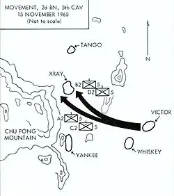 Nach Moores Plan sollten die Kompanien Alpha und Bravo nach Nordwesten Richtung Fluss vorrücken, Charlie nach Süden in Richtung Berg. Die schwere Infanteriekompanie Delta sollte mit Mörsern und schweren Maschinengewehren als Reserve in der Landezone bleiben.