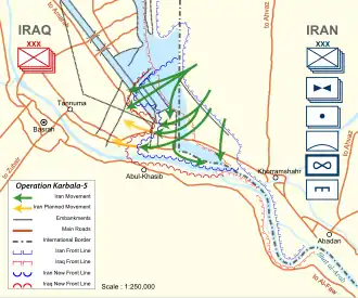 Die Operation Karbala 5 begann um Mitternacht des 8. Januar 1987, als eine Streitmacht von 35.000 Infanteristen der Revolutionsgarden (Pasdaran) den Fischsee überquerte, während vier iranische Divisionen am Südufer des Sees angriffen. Sie überrannten die irakischen Streitkräfte und eroberten Duaiji, einen Bewässerungskanal. Sie nutzten ihren Brückenkopf bei Duaiji als Sprungbrett, um den Schatt al-Arab zu überqueren. Zwischen dem 9. und 10. Januar durchbrachen die Iraner mit Panzern die erste und zweite Verteidigungslinie von Basra südlich des Fischsees.[2] Weiter nördlich wurde die 8. Division der Iraker eingekesselt und brach zusammen. Ihr General wurde gefangen genommen.[1] Die Pasdaran rückten an allen Fronten vor.