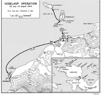 - ↑ a b c d e f g h i j Robert Ross Smith: US Army in WWII: The Approach to the Philippines. Chapter XVIII - Airfields on the Vogelkop Peninsula. In: ibiblio.org/hyperwar. U.S. Army Center of Military History, 1996, abgerufen am 13. November 2020 (englisch).