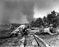 Als die erste Welle den Strand erreichte, eröffneten die mit schweren Maschinengewehren bestückten Amtracks das Feuer auf den Strand, doch bis auf wenige isolierte Schüsse, die aus einigen noch intakten Stellungen abgefeuert wurden, kam von japanischer Seite keine Gegenwehr. Die Bunker konnten von den Begleitzerstörern schnell ausgemacht und ausgeschaltet werden, so dass es auf amerikanischer Seite nur einen Toten und einige Verwundete bei den Landungstruppen gab. Innerhalb kurzer Zeit waren drei Bataillone der 40. Division an Land sowie einige Einheiten der California National Guard. Diese Truppen sicherten den Brückenkopf auf dem Strand nach allen Himmelsrichtungen.