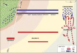 Nach den Aufzeichnungen des spätrömischen Historikers Ammianus Marcellinus sandte der römische Kaiser Constantius II. seinen Vetter Julian und den römischen Heermeister Barbatio nach Rauracum (heute Kaiseraugst), um die Alamannen zu bezwingen. Aufgrund des Laeten-Aufstands und laut Ammianus Marcellinus auch durch das Verschulden Barbatios, der Julian angeblich keine Erfolge gönnte, gelang es den Alamannen, das zahlenmäßig überlegene römische Heer in die Flucht zu schlagen.[2] Die Alamannen nutzten die Gelegenheit und besetzten zahlreiche linksrheinische Städte von Straßburg über Zabern, Speyer, Worms, Mainz, Bingen, Koblenz bis Andernach.