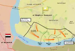 Am Abend des 1. März 2019 wurden die Angriffe der SDF wieder aufgenommen.[9] Deren Angaben zufolge erstreckte sich das verbleibende Gebiet nur auf einige Zeltstädte, die über Tunnel verbunden waren. In den Tunneln und Höhlen versteckten sich die ISIL-Kämpfer, bereit zu heftigem Widerstand.