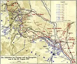 Die Schlacht von Mărășești umfasst eine Reihe weiträumiger aber taktisch zusammenhängender Kämpfe im Raum Focșani, die sich vom 6. August (24. Juli) bis 3. September (21. August) 1917 im Kreis Vrancea zwischen den Flüssen Sereth und Putna mit Konzentration an der Linie Muncelu – Mărășești ereigneten. Sie wurde in der deutschen Weltkriegsgeschichtsschreibung traditionell als „Durchbruchsschlacht an der Putna und Sușita“ bezeichnet.[1] Die seit Dezember 1916 intensivsten Kämpfe am rumänischen Kriegsschauplatz, die eine direkte Fortsetzung der Schlacht von Mărăști (22. Juli – 1. August) darstellten, erstreckten sich über einen Zeitraum von 29 Tagen, von denen nur an 16 Tagen größere militärische Aktionen stattfanden. Die großen Verluste bei der Offensive zwangen die Mittelmächte, ihre Angriffe an der rumänischen Front aufzugeben und dauerhaft in die Defensive überzugehen. Aus rumänischer Sicht handelt es sich um die bedeutendste Schlacht des Ersten Weltkriegs, die auch als „das rumänische Verdun“ charakterisiert wird.[2]