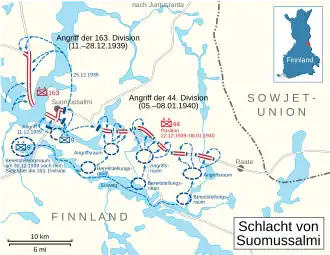 Die Schlacht von Suomussalmi fand im Winterkrieg zwischen Finnland und der Sowjetunion vom 7. Dezember 1939 bis zum 8. Januar 1940 bei Suomussalmi statt. Die Rote Armee schickte mit der 163. Schützendivision und der 44. Motorisierten Schützendivision rund 36.000[1] Soldaten ins Feld. Die finnischen Kräfte mit einer Maximalstärke von rund 11.500[2] Soldaten zerschlugen die beiden sowjetischen Formationen und verhinderten so den Versuch, Finnlands Verkehrsverbindungen nach Schweden abzuschneiden. Die Schlacht bedeutete für Finnland einen propagandistischen Erfolg; sie beeinflusste den Kriegsverlauf aber nicht entscheidend.