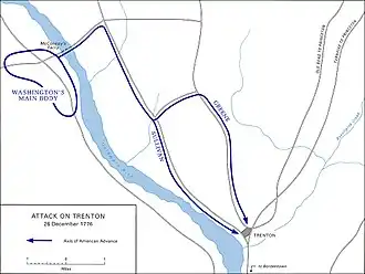 Der amerikanische Schlachtplan sah koordinierte Attacken aus drei verschiedenen Richtungen vor. General John Cadwalader sollte die britische Garnison in Bordentown angreifen, um zu verhindern, dass von dort Verstärkung entsandt werden konnte. General James Ewing sollte mit 700 Soldaten den Fluss Delaware mit der Trenton-Fähre überqueren und die Brücke am Assunpink Creek besetzen, um den Fluchtweg für die feindlichen Truppen zu blockieren. Die Hauptstoßrichtung sollte mit 2400 Soldaten neun Meilen nördlich von Trenton über den Fluss erfolgen und sich dann in zwei Gruppen aufteilen. Die Generäle Greene und Sullivan sollten mit diesen zwei Gruppen den Hauptangriff unmittelbar vor der Morgendämmerung führen.[2]