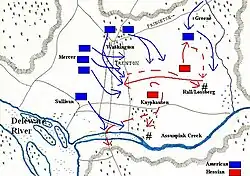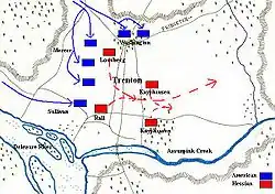 Am Nordende Trentons waren 35 hessische Jäger unter dem Kommando von Leutnant Grothausen stationiert. Als diese die Vorhut von Sullivans Truppen sahen, versuchten sie sich über die Assunpike-Brücke zurückzuziehen. Erst langsam formierten sich die drei hessischen Regimenter zum Widerstand. Rall wurde von seinem Adjutanten, Leutnant Biel, geweckt, als in der Stadt schon gekämpft wurde. Amerikanische Einheiten hatten bereits die Schanze an der King- und Queen-Street eingenommen und zwei Kanonen in Stellung gebracht. Damit kontrollierten sie alle Hauptausgänge der Stadt. Die Hessen versuchten ihrerseits, vier Kanonen in Stellung zu bringen, was aber durch anhaltendes feindliches Feuer verhindert wurde.[7] Die verbliebenen amerikanischen Einheiten umschlossen die Stadt, um die noch kämpfenden Hessen einzukesseln.[2]
