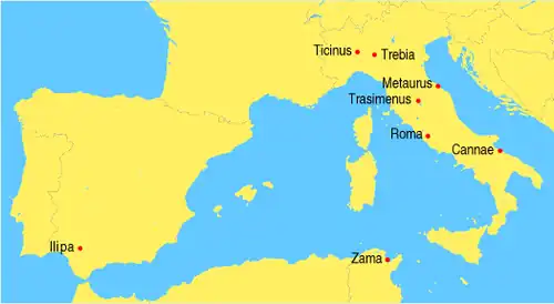 Saguntum – Lilybaeum II – Rhone – Ticinus – Trebia – Cissa – Trasimenischer See – Ager Falernus – Geronium – Cannae – Nola I – Nola II – Ibera – Cornus – Nola III – Beneventum I – Syrakus – Tarentum I – Capua I – Beneventum II – Silarus – Herdonia I – Obere Baetis – Capua II – Herdonia II – Numistro – Asculum – Tarentum II – Neu Karthago – Baecula – Grumentum – Metaurus – Ilipa – Crotona – Große Felder – Cirta –