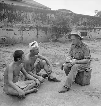 ![]() Ein Offizier des Combined Services Detail Interrogation Centre (CSDIC) verhört Oberstabsfeldwebel Ogawa Mitsuo von der japanischen 38. Seedienstkompanie und den Obergefreiten Murakami Shoichi von der japanischen 55. Division im Raum Sittang, 8. August 1945 | |||||||||
