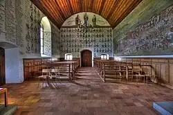 An den Seitenwänden und der Rückwand sind seit 1886 die Namen der gefallenen Eidgenossen und die Wappen und Namen von Adligen aufgeführt, die auf Seiten der Habsburger fielen. Bei den Eidgenossen erscheint der Name von Arnold von Winkelried als «Erni Winckelried». In der Chorwand sind die habsburgischen Banner und die Namen ihrer Träger aufgemalt. Die drei Altäre nehmen zur übrigen Ausstattung der Kapelle keinen Bezug. Sie sind nicht signiert und stammen aus dem 17. Jahrhundert.