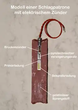 Sprengstoffe, insbesondere gelatinöse Sprengstoffe, werden häufig in Form von Stangen, sogenannten Patronen, geliefert. Werden nun die Sprengstoffpatronen mit einem sprengkräftigen Zünder, z. B. einem elektrischen Zünder, versehen, so wird daraus nun eine Schlagpatrone.