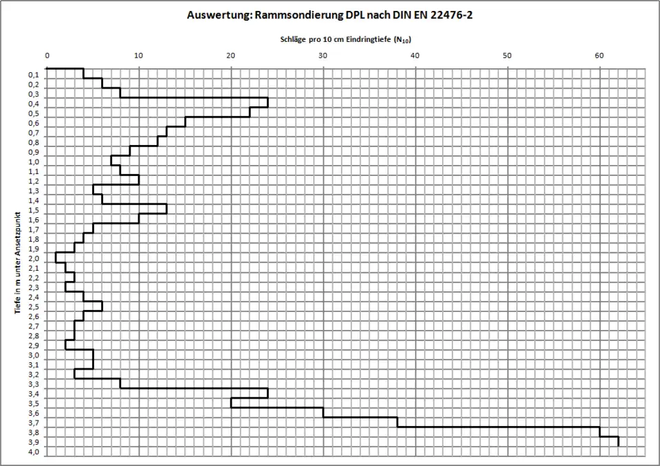 Diese Darstellung ermöglicht eine einfache Beurteilung der Lagerungsdichte. Die Auswertung ist zumeist nur qualitativ möglich, da verschiedene geotechnische Bedingungen wie Ungleichförmigkeit des Bodenmaterials, Wassergehalt und Reibung des Sondiergestänges die Schlagzahl beeinflussen.