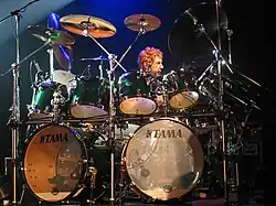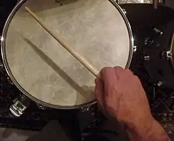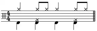 - indem die 'Führungshand' (bei Rechtshändern: rechts) gleichmäßig acht Beats (Zählzeiten) auf dem (Ride-)Becken (oder Hihatbecken) schlägt oder verklanglicht,