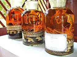 Schlangenschnaps gibt es in zwei Varianten: Bei einer wird der Körper einer toten Schlange in eine Flasche Reiswein eingelegt. Meist befinden sich in der Flasche weitere kleine Schlangen, Schildkröten, Insekten oder auch kleine Vögel. Die Flüssigkeit mit der Schlange wird für einige Monate gelagert.
