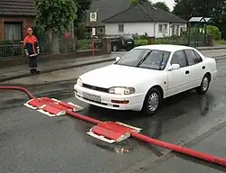 Bei Schlauchleitungen über lange Strecken oder zu einer Einsatzstelle auf der anderen Seite der Straße als die Wasserentnahmestelle müssen Schlauchbrücken verwendet werden, um den Verkehr nicht zum Stehen zu bringen und um Schäden an den Schläuchen zu vermeiden.