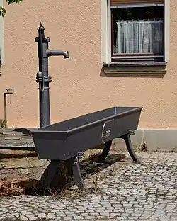 - Brunnen: gusseiserner Pumpschwengel mit Eisenwanne, bezeichnet „1880“; vor Haus Nr. 8[25]