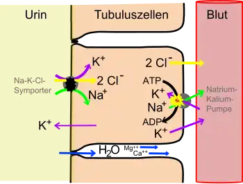 Schleifendiuretika wirken nun, indem sie den Na+K+2Cl−-Symporter reversibel (umkehrbar) hemmen. Natrium kann nicht mehr rückresorbiert werden, weshalb der Harn konzentriert bleibt. Dies führt durch Osmose zu vermehrter Wasserausscheidung. Da nun auch keine negative Membranspannung aufgebaut werden kann, verbleiben Calcium- und Magnesiumionen im Urin und gehen dem Körper verloren.