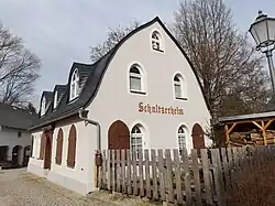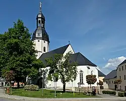 - Das Ortsrathaus (Adresse Markt 1), mit einem kleinen Uhrentürmchen, einem schiefergedeckten Dach und eher in den Formen einer Kirche ausgeführt, ist eine Außenstelle der erfüllenden Stadtgemeinde Scheibenberg.[14]
